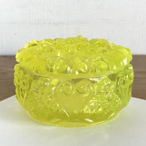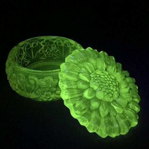 紫外線が当たると蛍光に発色するウランガラスで作られた小物入れです。