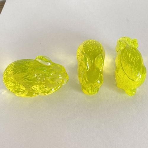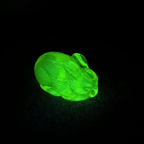 紫外線が当たると蛍光に発色するウランガラスで作られた置物です。