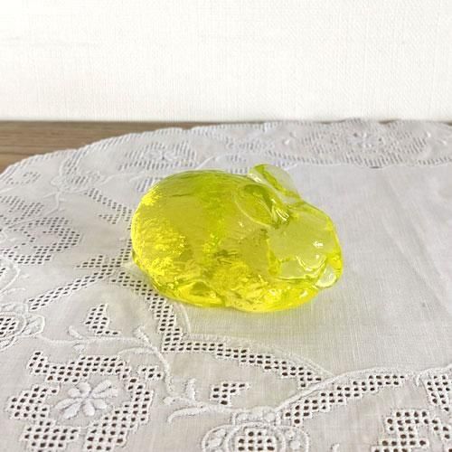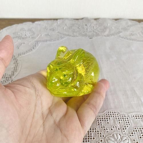 暗闇でもブラックライトをあてると美しく光るのがウランガラスの特徴ですが、こちらの置物は発色が強いため紫外線の多い自然光でもぼんやりと光って見えます。