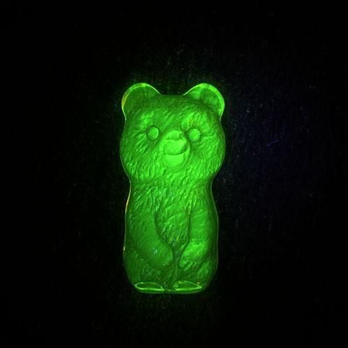 紫外線が当たると蛍光黄緑に発色するウランガラスで作られた置物です。