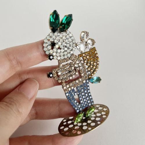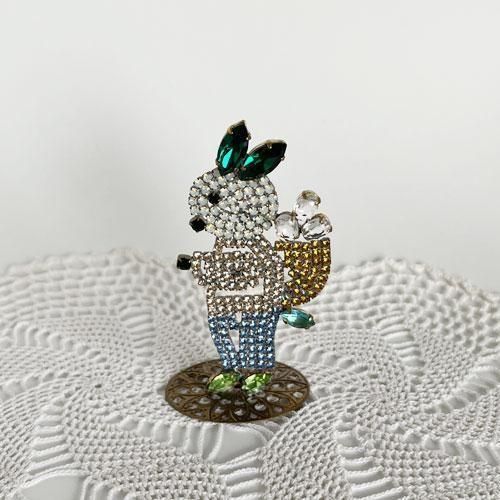 チェコ ガラス製ラインストーンの置物 イースターバニー 緑の耳×ベージュ