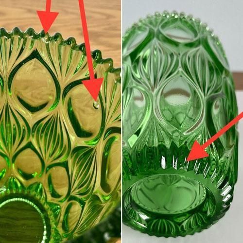 詳細画像で矢印で示している部分、縁や底にも小さなカケがあり、またガラス本体に大きな気泡もございます。