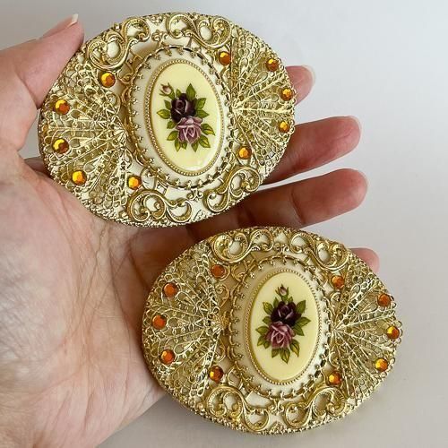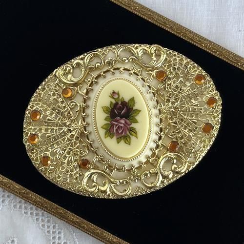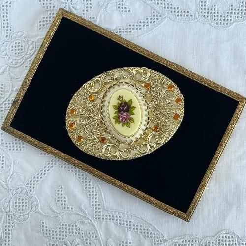 装飾に使われていカボションはおそらくガラス製、金属部分は真鍮です。