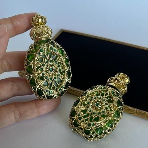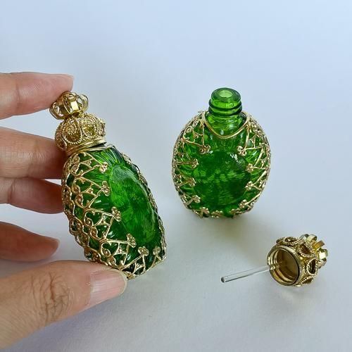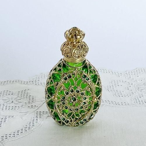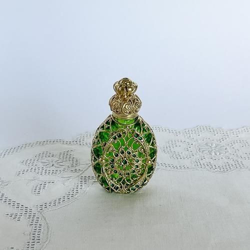香水瓶本体は、ファーングリーン色の楕円型のものです。