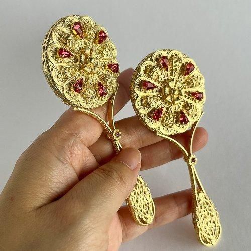 装飾は古くからヤブロネッツで作られているジュエリーと同じ手法で作られており、プレス機で形作られた複数の金属パーツを溶接し組み立て、ひとつひとつガラスストーンをはめ込んで作られています。