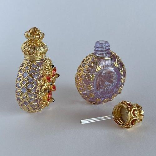 香水瓶本体は、自然光や白熱灯の下では紫色に、蛍光灯の下では水色に見えるアレキサンドライトガラスでできています。
