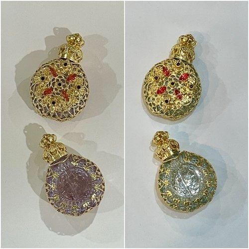 装飾は古くからヤブロネッツで作られているジュエリーと同じ手法で作られており、プレス機で形作られた複数の金属パーツを溶接し組み立て、ひとつひとつガラスストーンをはめ込んで作られています。