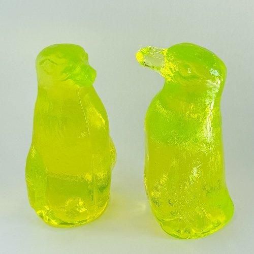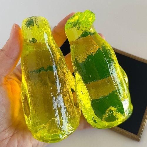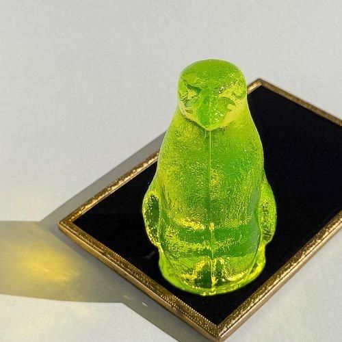 紫外線が当たると蛍光黄緑に発色するウランガラスで作られた置物です。