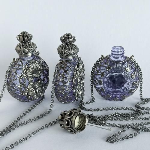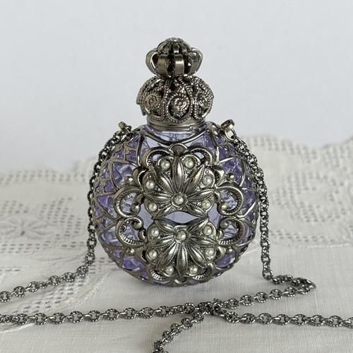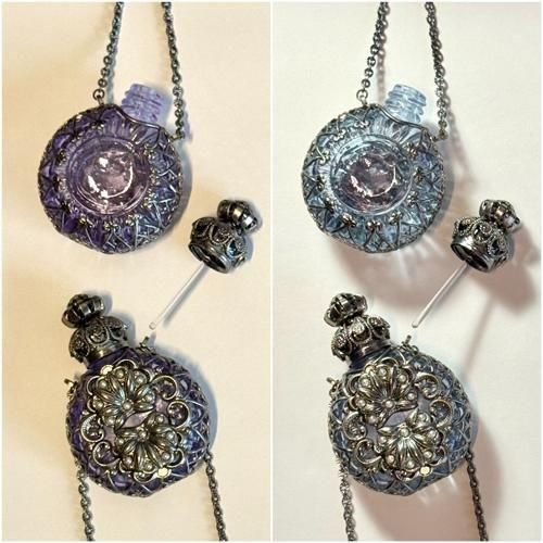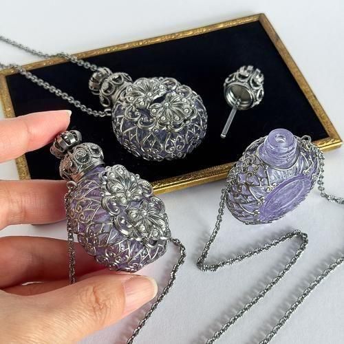 香水瓶本体は、自然光や白熱灯の下では紫色に、蛍光灯の下では水色に見えるアレキサンドライトガラスでできています。