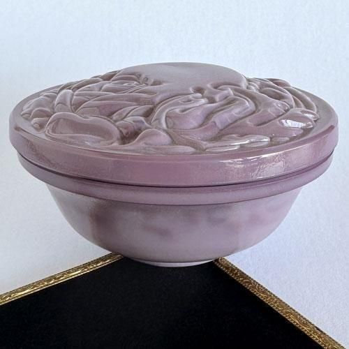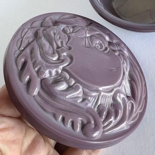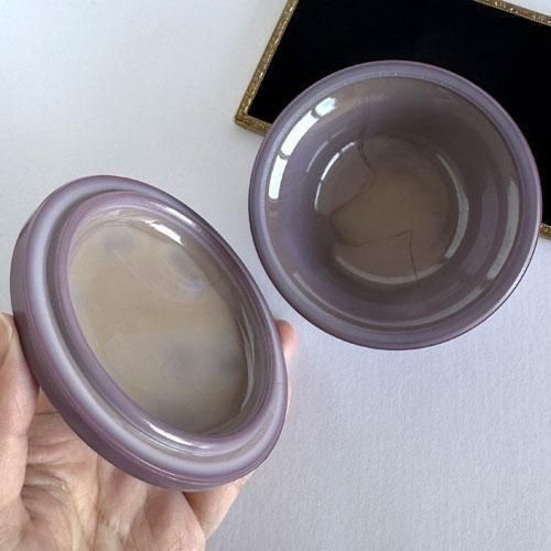 型に溶かしたガラスを流し込み圧をかけて成型するプレスガラスという手法で作られた小物入れです。