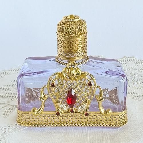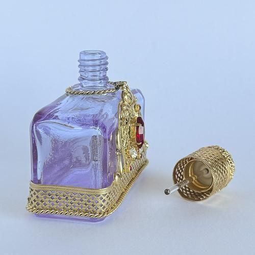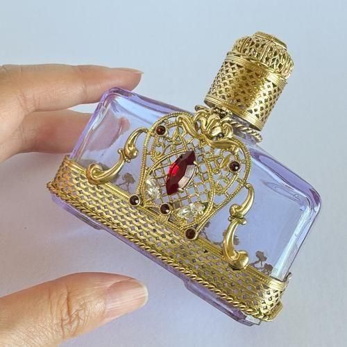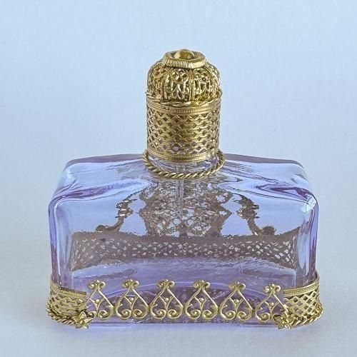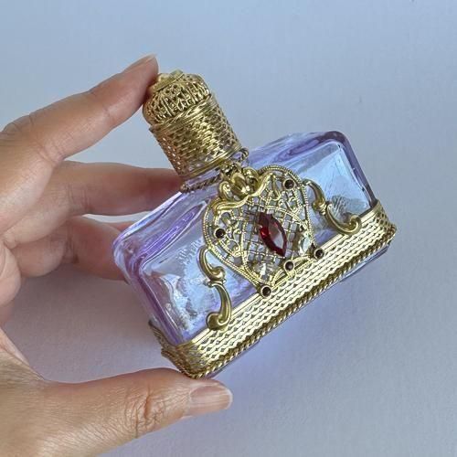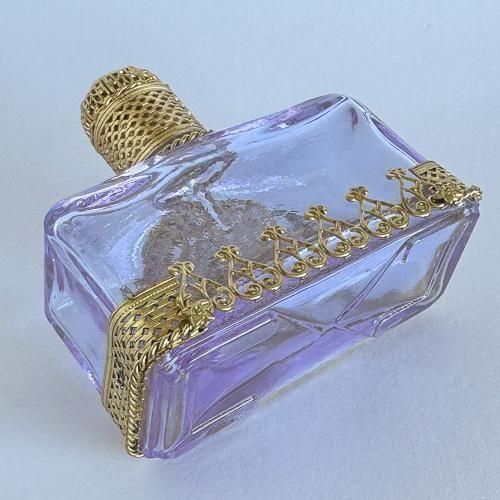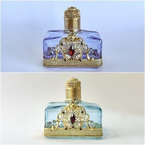 香水瓶本体は、自然光や白熱灯の下では紫色に、蛍光灯の下では水色に見えるアレキサンドライトガラスでできています。
