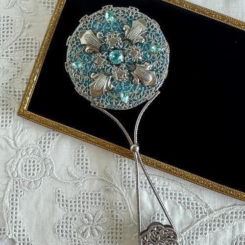 チェコ 装飾付き手鏡 48 直径5.5cm クロス 水色