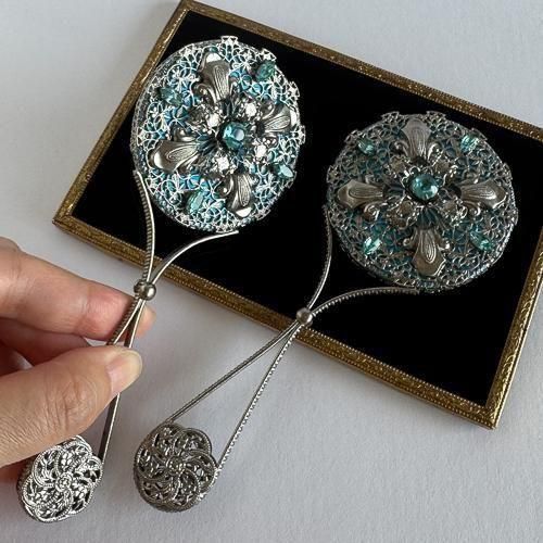装飾は古くからヤブロネッツで作られているジュエリーと同じ手法で作られており、プレス機で形作られた複数の金属パーツを溶接し組み立て、ひとつひとつガラスストーンをはめ込んで作られています。