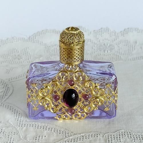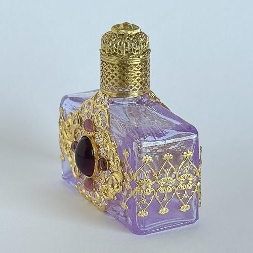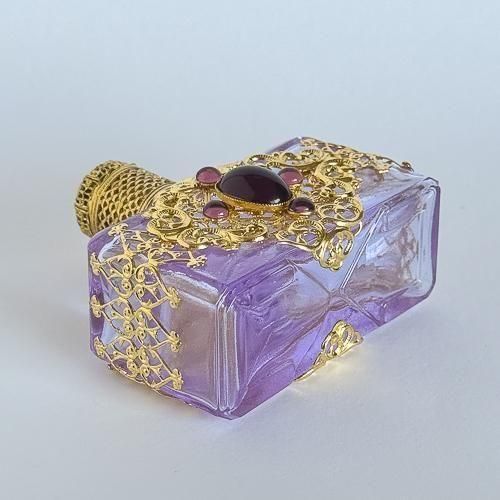 香水瓶本体は、自然光や白熱灯の下では紫色に、蛍光灯の下では水色に見えるアレキサンドライトガラスでできています。