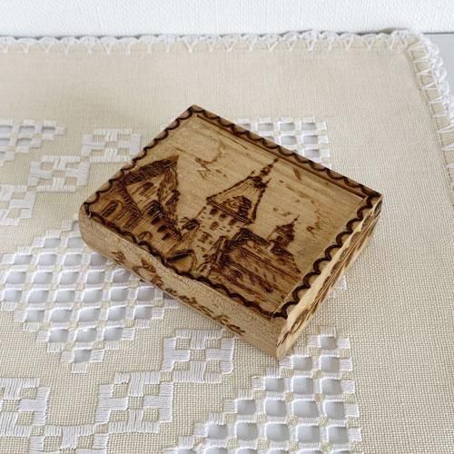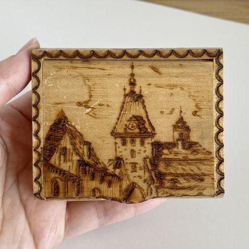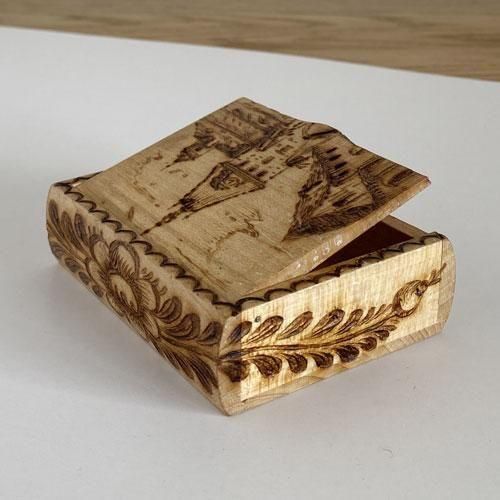 ウッドバーニング(焦がし絵)で建物や伝統模様が描かれており、側面には「z Chodska」と文字が入っています。