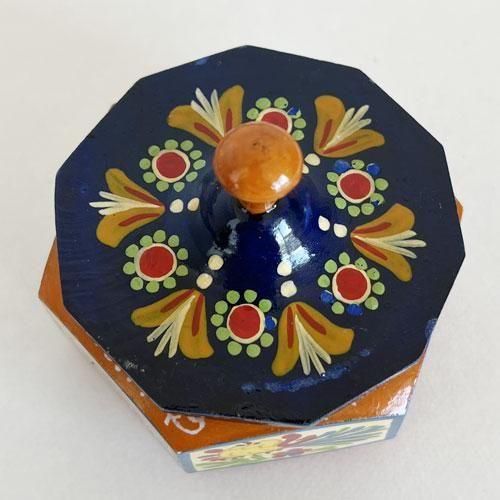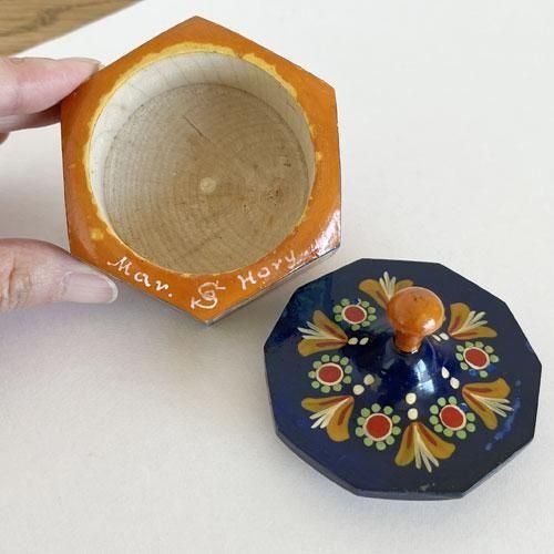 本体は六角形、蓋は十角形という珍しい形の木箱です。