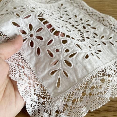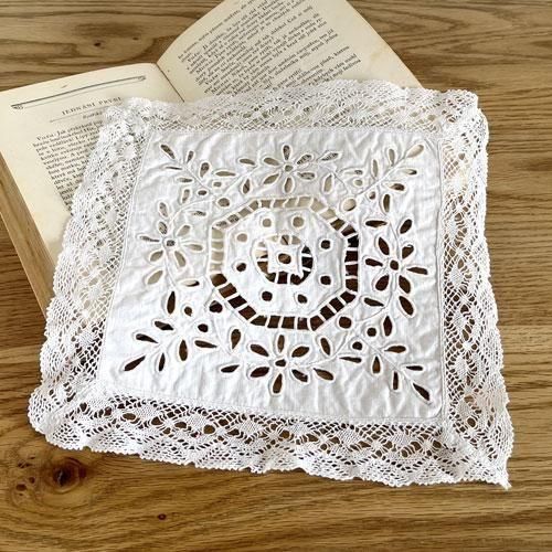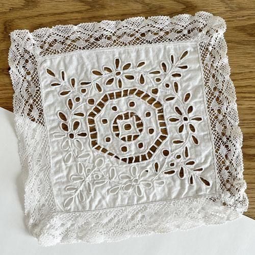 ドイツのヴィンテージ手刺繍クロス 25×25 白のカットワーク刺繍