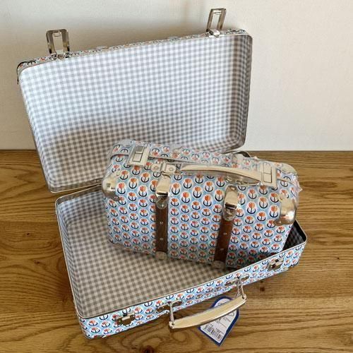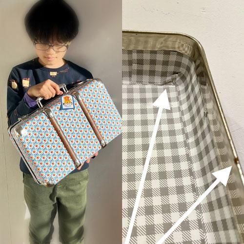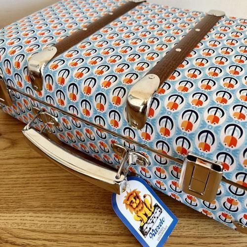 昔から変わらないKAZETOのレトロな形のスーツケースと、モダンな柄の布の組み合わせが絶妙でとてもかわいいです。