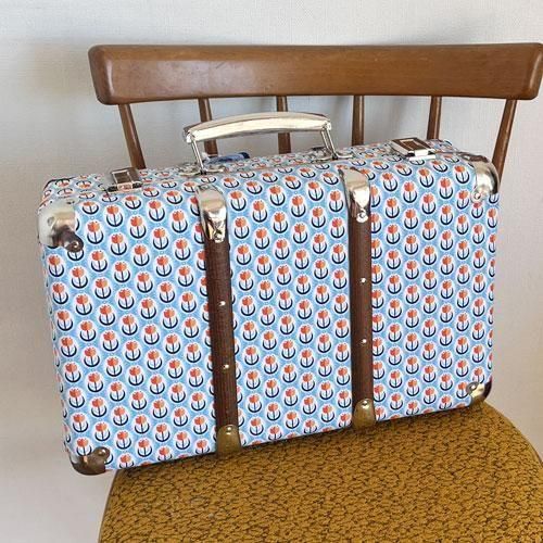 チェコ製の布張スーツケース 水玉チューリップ 水色 大