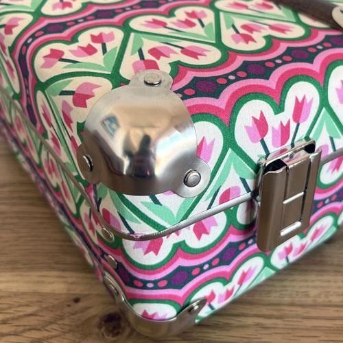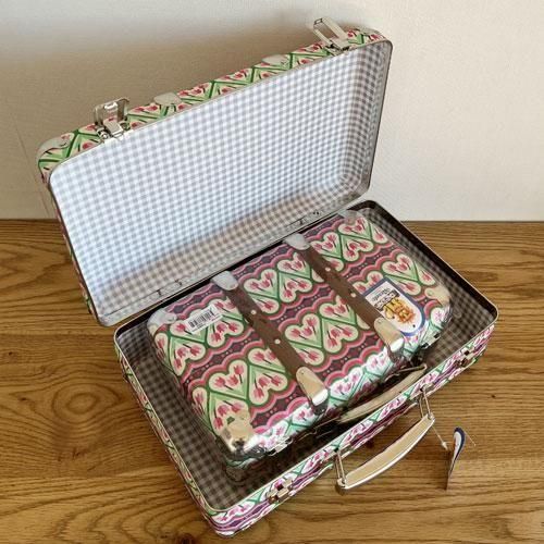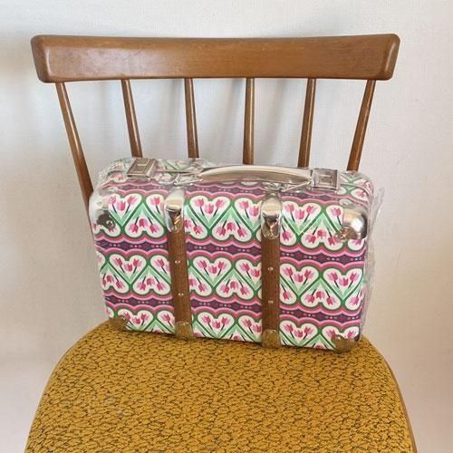 昔から変わらないKAZETOのレトロな形のスーツケースと、モダンな柄の布の組み合わせが絶妙でとてもかわいいです。