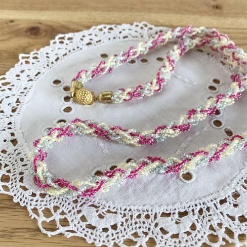 こちらのネックレスは、ピンクと黄色と水色のビーズを編み込んだデザインで、一連ですがとてもインパクトがあります。