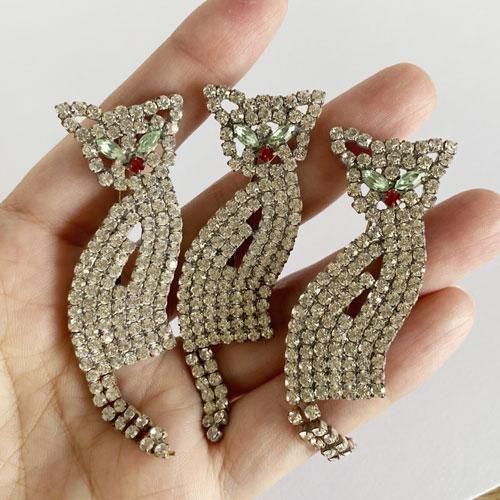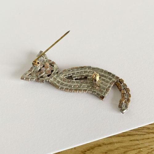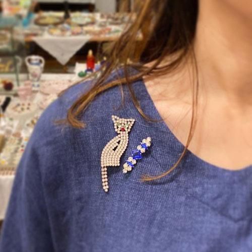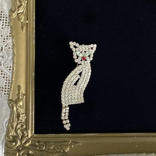 チェコ ガラス製ラインストーンのブローチ 尻尾ユラユラ猫