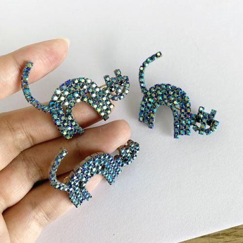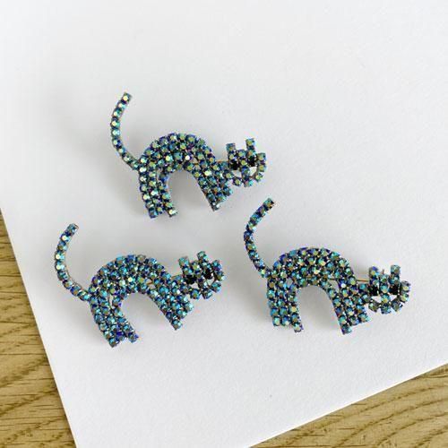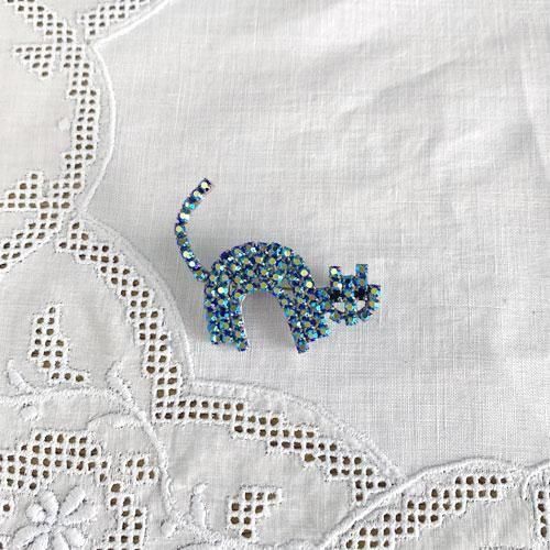 チェコ ガラス製ラインストーンのブローチ 尻尾ピーン猫 メタリックブルー