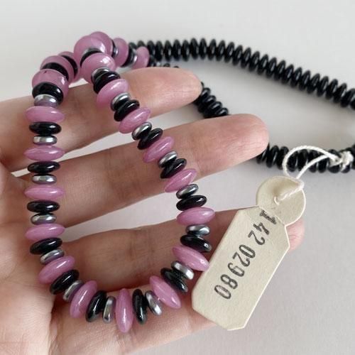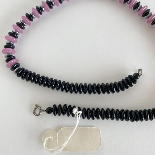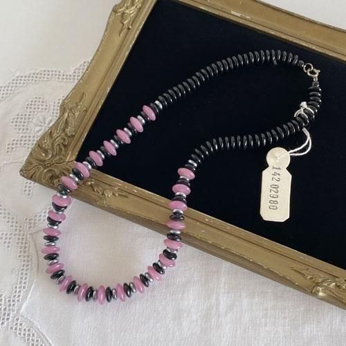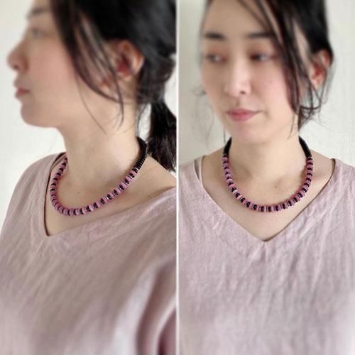 こちらのネックレスは、円盤型の黒とシルバー、それから紫とピンクが混ざったような色のビーズで作られています。