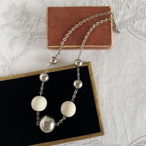 チェコガラスのヴィンテージネックレス 大粒の白色ウランガラス