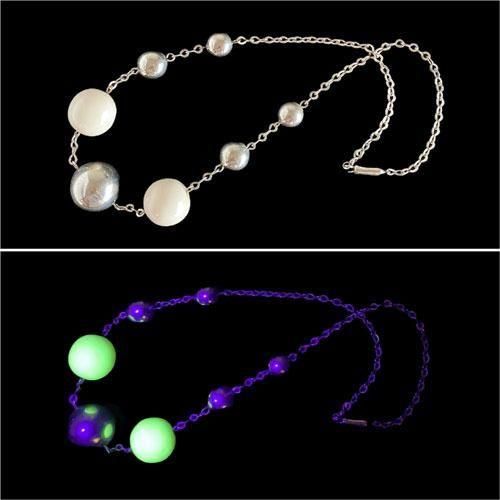 大きな白色のガラスはウランガラスで、紫外線が出るブラックライトを当てると蛍光黄緑色に発色します。