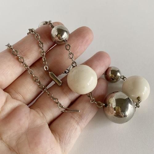 こちらのネックレスは、白色のウランガラスと、銀色のメタルビーズが使われています。