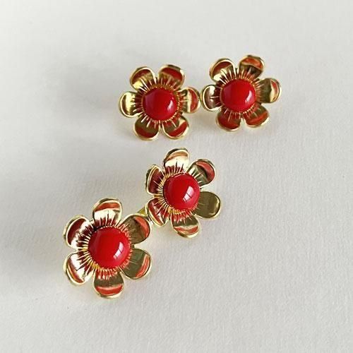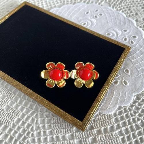 チェコ 戦前の型で作られた赤ガラスのブローチ 2つの花