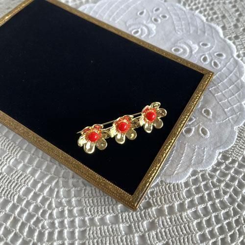チェコ 戦前の型で作られた赤ガラスのブローチ 3つの花