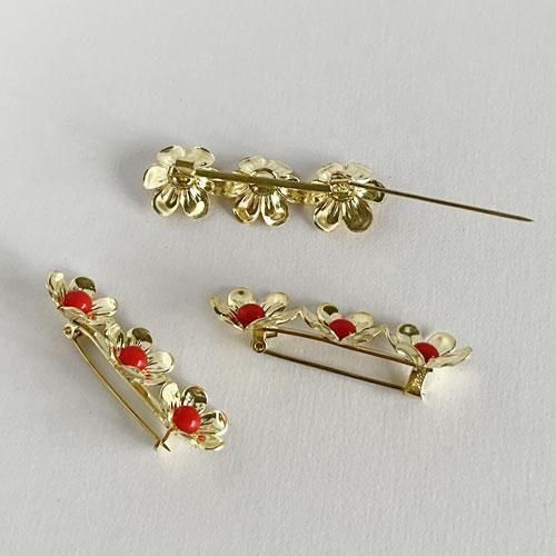1930〜40年代に作られていたブローチの型を使って近年作られたもので、金属部分はプレス機で真鍮をプレスし、ゴールドメッキがかけられています。