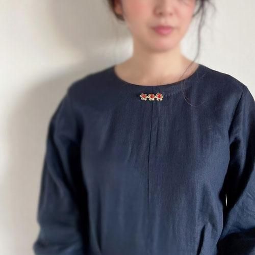 着画のように、首元の中央に横向きにつけると少し下を向いてしまいますが、その様子も控え目で可愛いなと思いました。(モチーフが下を向くのがお嫌な方は、ニットなど厚手のお洋服に縦斜めにつけていただくとお花が正面を向きます。)