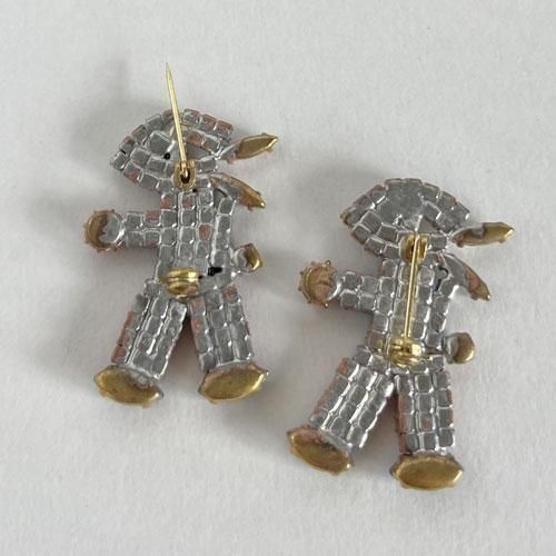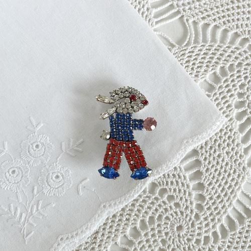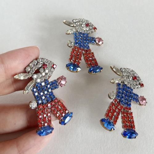 チェコ ガラス製ラインストーンのブローチ うさぎ 青×明るい赤ズボン