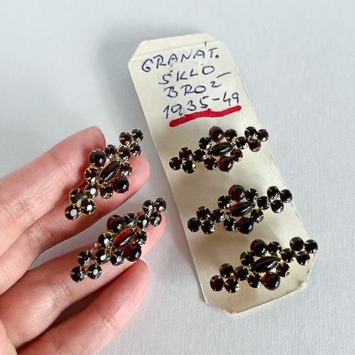写真に写っている台紙に書かれた文字はチェコ語で「GRANAT(ガーネット)SKLO(ガラス)BROZ(ブローチ)」です。