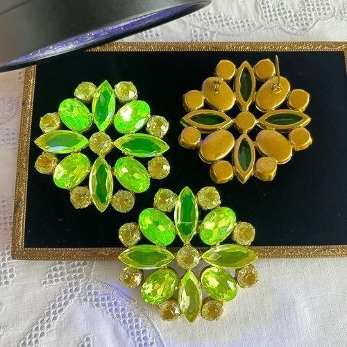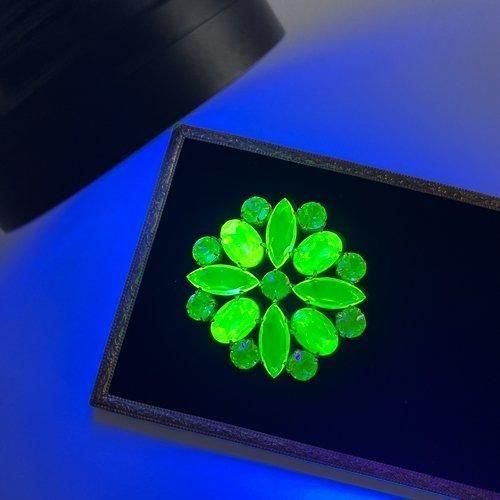 こちらのブローチに使われているガラスストーンは、全てウランガラスで作れらています。