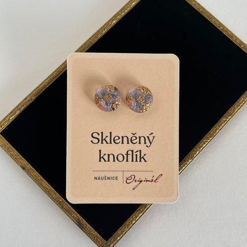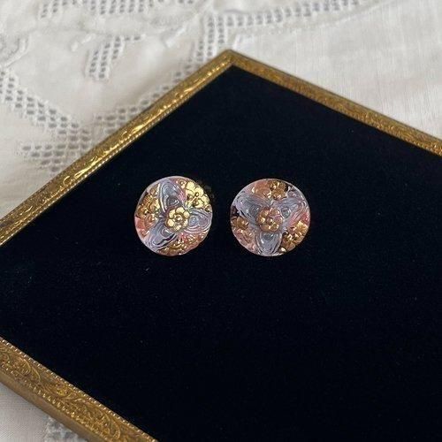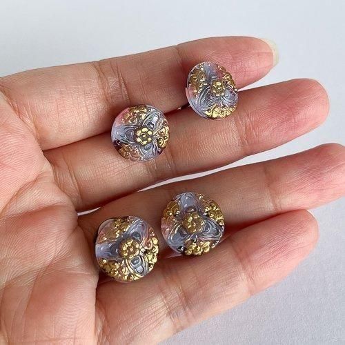 炉で溶かしたガラス棒を金属の型で挟み形を作り、縁を研磨し、ハンドペイントで色付けをし焼成をして作られたボタンをピアスに加工してあります。