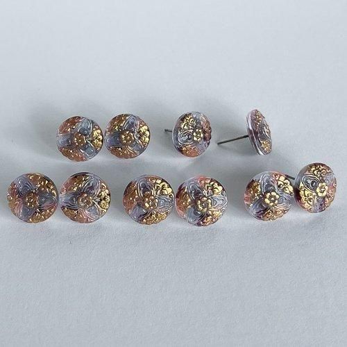 チェコ製ガラスボタンのピアス/イヤリング 三角の花 ピンク紫に金