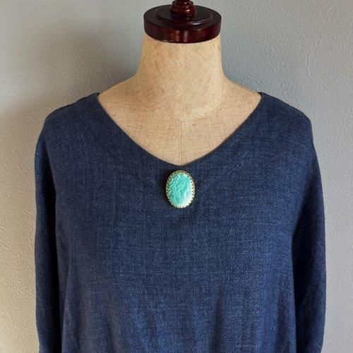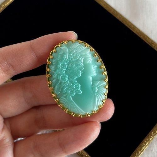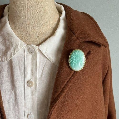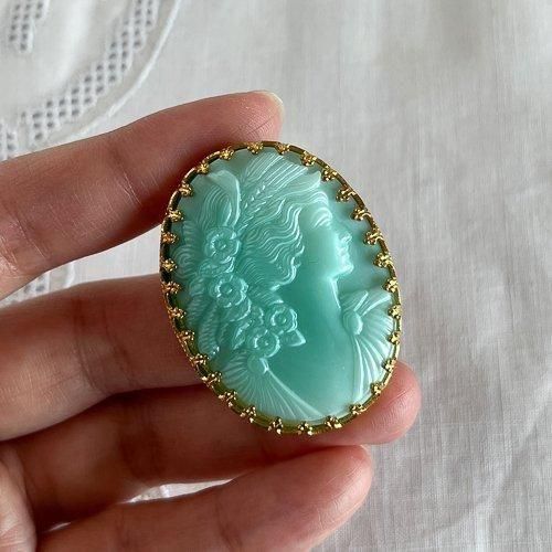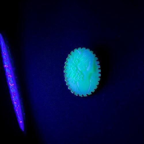 倉庫に眠っていたウランガラスで作られたガラスカメオをブローチに仕立てたもの。