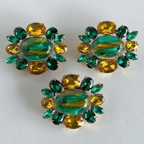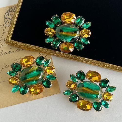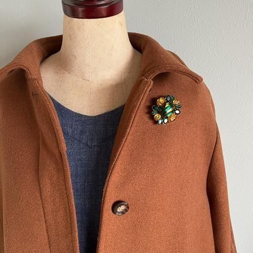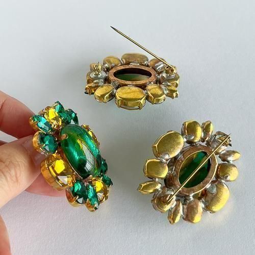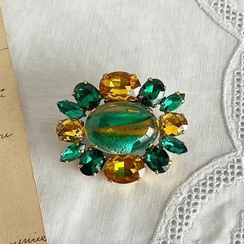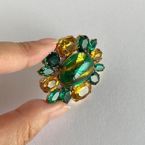 チェコ製 ハンドメイドガラスのブローチ 緑とライトトパーズ