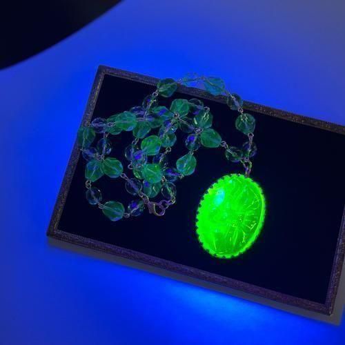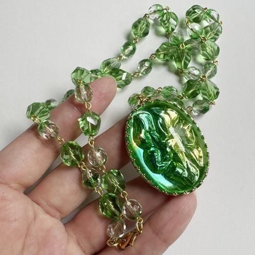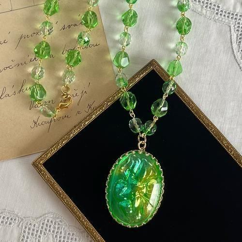 チェコ製 ウランガラスのネックレス インタリオの花 緑
