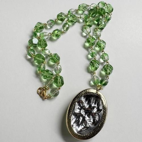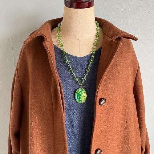 ネックレス部分のガラスビーズは、大きなサイズ(10mm)は発色が少し弱めですがウランガラス、少し小さなサイズ(8mm)は透明に緑がグラデーションに入ったビーズで、こちらはウランガラスではありません。