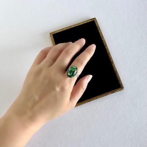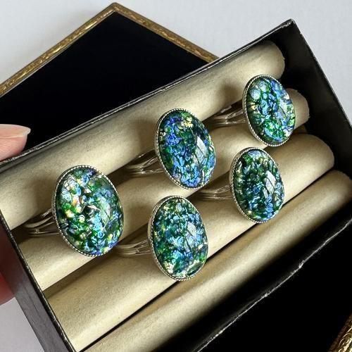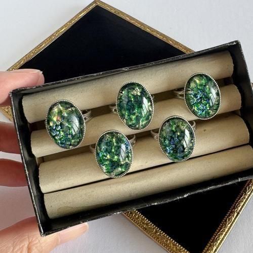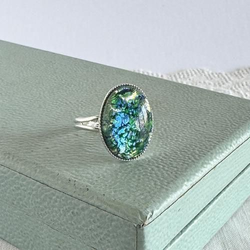 チェコ製 ハンドメイドガラスの指輪 楕円 緑×青シラー