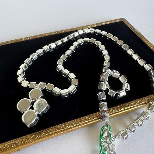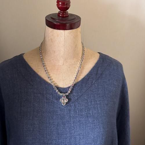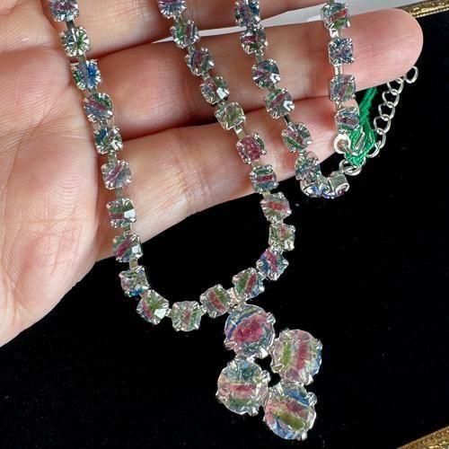 こちらのネックレスは数多くのアイリスガラスを使用しているため、中にはきちんと赤青緑の3色が入っておらず、ほぼ透明に見えるものも含まれています。