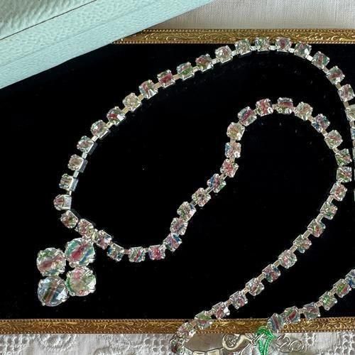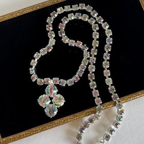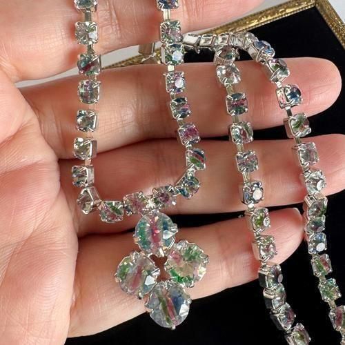 こちらのネックレスは数多くのアイリスガラスを使用しているため、中にはきちんと赤青緑の3色が入っておらず、ほぼ透明に見えるものも含まれています。