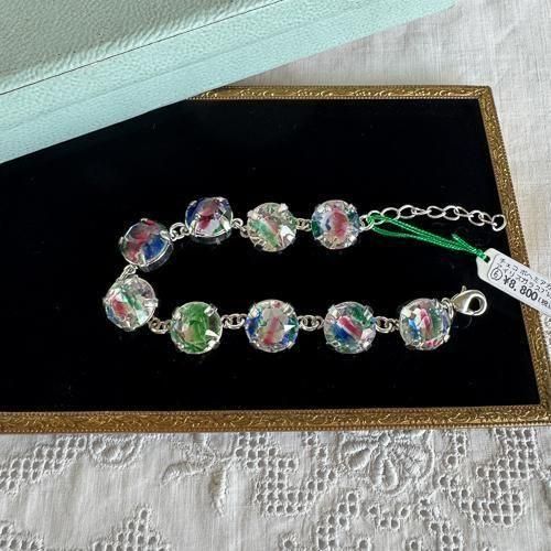 こちらのブレスレットは数多くのアイリスガラスを使用しているため、中にはきちんと赤青緑の3色が入っておらず、ほぼ透明に見えるものも含まれています。