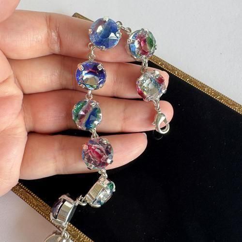 こちらのブレスレットは数多くのアイリスガラスを使用しているため、中にはきちんと赤青緑の3色が入っておらず、ほぼ透明に見えるものも含まれています。
