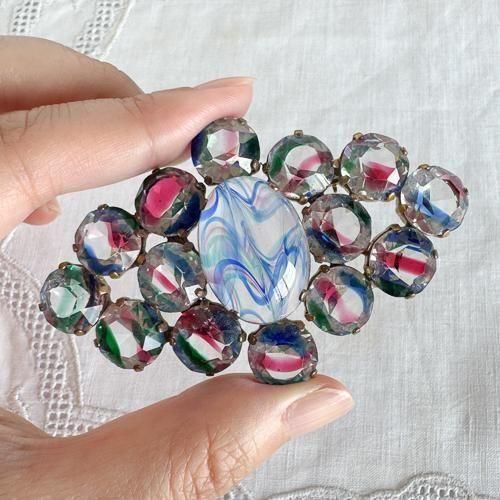 こちらのブローチは複数の大粒アイリスガラスを使用しているため、赤青緑の3色が入っているもの/入っていないもの、色の濃いもの/薄いものがございます。
